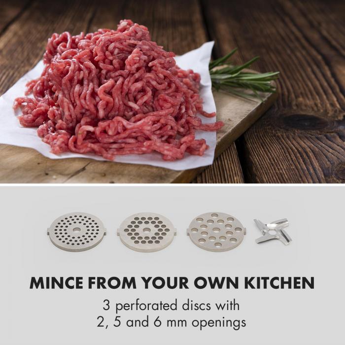 Mlýnek na maso Klarstein Curve semele i tvrdé kousky masa na jemnou hmotu. Tři děrované kotouče s průchozími otvory (3, 5 a 6 mm) umožňují umlít maso na různou tloušťku. Všechny části (kromě posuvníku z plastu) jsou vyrobeny z ušlechtilé oceli, čili se snadno čistí. S mlýnkem dostanete nástavce na klobásy, na kebbe a na těsto. Mlýnek je vhodný pro všechny kuchyňské roboty Curve.