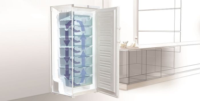 Skříňová mraznička disponuje funkcí rychlého mražení SuperFrost. Ta prudce sníží teplotu až na -32 °C, čímž se omezí krystalizační efekt vody. Funkce během našeho testu fungovala výborně a po ukončení procesu se automaticky vypnula. Takové rychlé mrazení nově vložených potravin zachovává maximum nutričních látek. Potěšilo nás, že spotřebič jsme nemuseli rozmrazovat ručně, protože disponuje technologií NoFrost. Pomocí cirkulace ledového vzduchu se odebírá teplo a nadbytečná vlhkost se odvádí mimo úložný prostor.