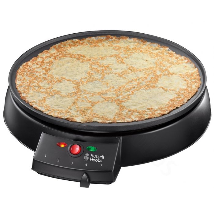 S palačinkovačem Russel Hobbs s vysokým výkonem (1 200 W), nastavitelnou teplotou, nepřilnavým povrchem a rovnoměrným nahříváním připravíte dokonalé tenoučké palačinky, které budou hotové během okamžiku. Deska má průměr 30 cm a vyvýšené okraje, které zabrání nechtěnému rozlití těsta. Palačinkovač je vybaven světelnou kontrolkou, která vás upozorní jak na jeho zapnutí, tak i na nahřátí desky. Při přípravě palačinek navíc nemusíte použít žádný tuk. Součástí balení jsou pomůcky na roztírání a obracení cesta