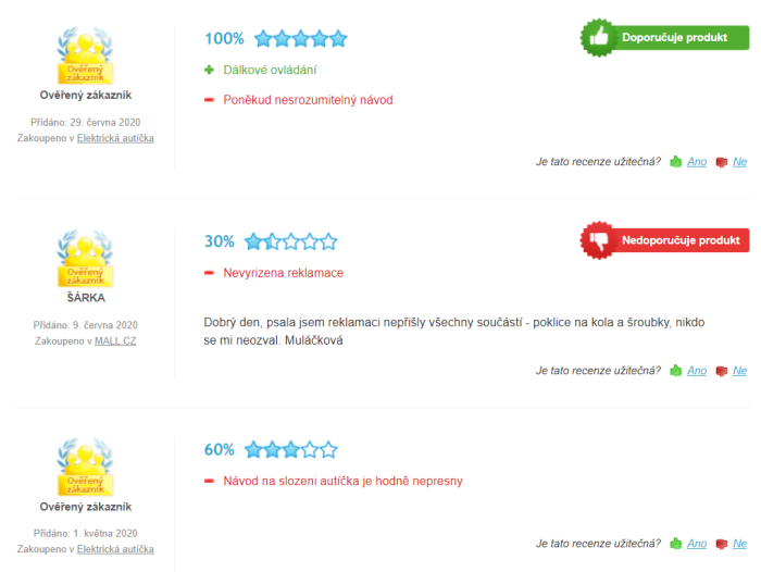 Volvo XC90 zákazníci si pochvalují. Za plusy považují výkonné motory a jednoduché ovládání. Jediné negativum, které jsme našli je, že Volvo je zjevně docela náročné na smontování. Peg-Pérego John Deere Gator HPX milují ho děti i dospělí. Pochvalují si výkon, pohon kol a dobrou stabilitu. Na negativní hodnocení jsme nenarazili.